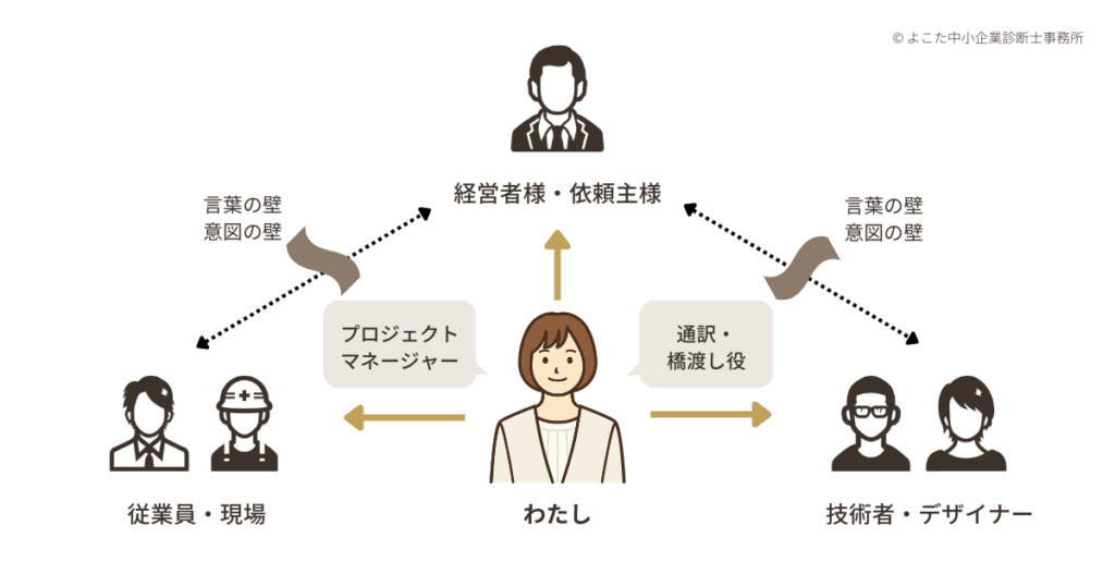 経営者と現場、依頼主さまと技術者やデザイナーなど、異なる立場をつなぎ、言葉の壁や意図の壁を解消する「通訳」として。